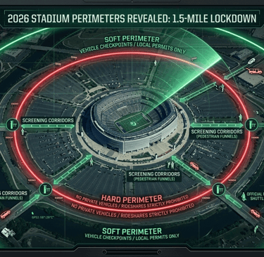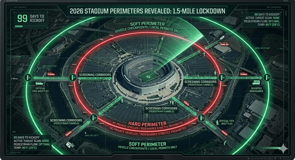 "In the 2022 tournament, we saw thousands of fans stranded because their GPS led them to a barricaded police checkpoint," says the Kickoff-USA Logistics Lead. "For 2026, the scale is 3x larger. You need to know exactly where the 'Soft Perimeter' ends and the 'Hard Zone' begins before you leave your hotel."