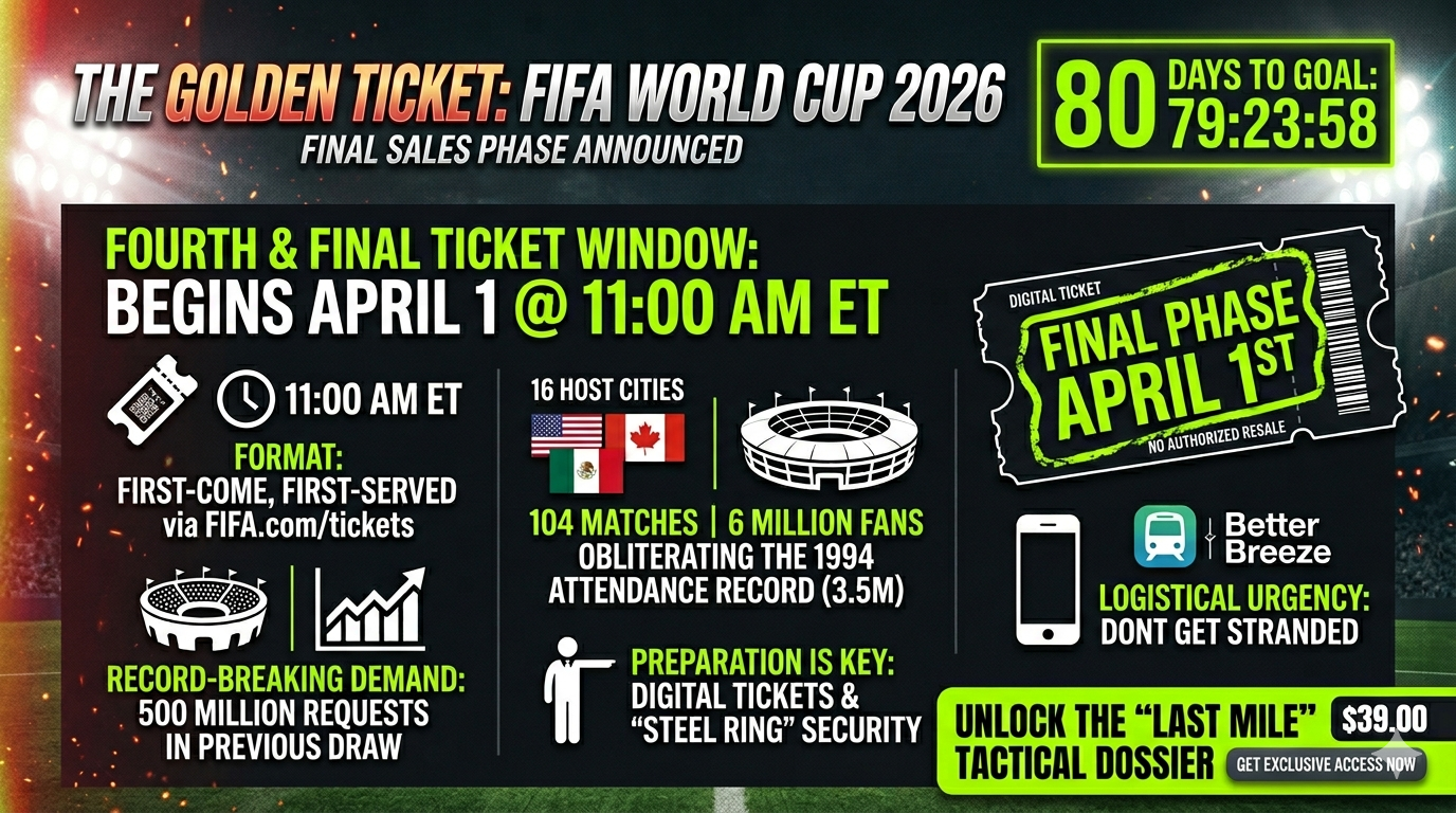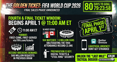 Soccer is officially taking over North America. As FIFA prepares to obliterate the 1994 attendance record, the final ticket sales phase has been triggered. We go inside the numbers to show you where the best chances are, how the "Steel Ring" digital tickets work, and why April 1st is your last stand for a guaranteed seat in 2026.